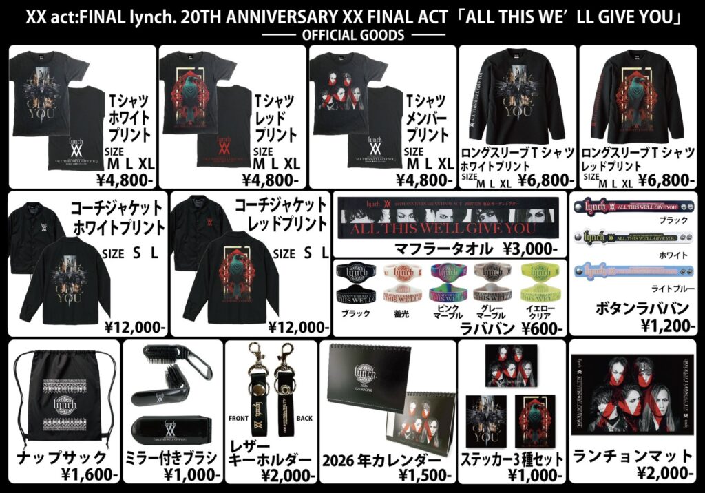 INFORMATION lynch. 20TH ANNIVERSARY XX FINAL ACT 「ALL THIS WE’LL GIVE YOU」 2025年12月28日(日) 東京ガーデンシアター 先行物販 先行物販は12:00より開始予定! メンバーサイン入りのlynch.アニバーサリーブック『FIVE SOULS』の会場先行分も同時刻より販売! お待ちしております。 2025.12.26 UPDATE